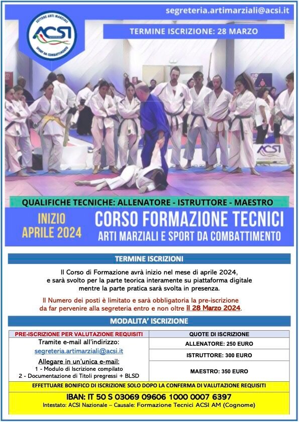 Lezione sui ” CASI CLINICI IN PALESTRA” per il Corso di aggiornamento per Istruttori/ Maestri di Arti Marziali CONI – ACSI che si svolerà presso la sede ACSI di Milano in Via Giuseppe Govone 100, domenica 28 settembre 2025 dalle 14 alle 1730.